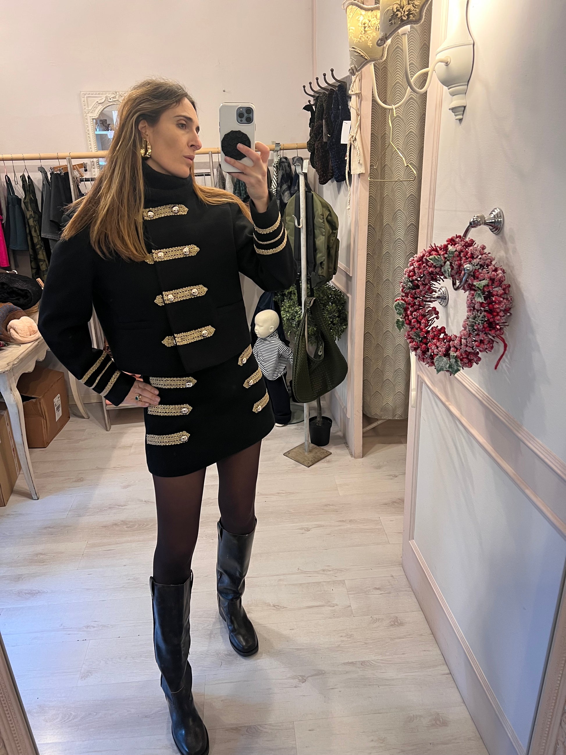 Giacca crop nera con dettagli oro